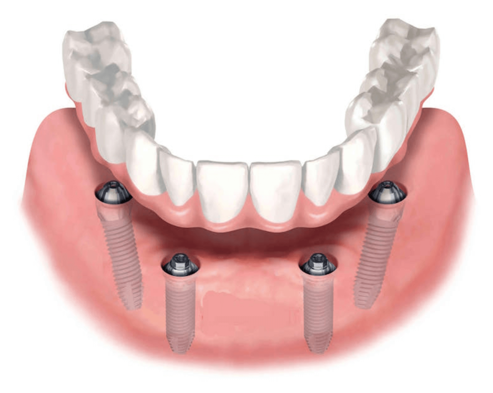 Минусы метода: не всем подходит — имплантация по технологии All-on-4 требует определённого объёма костной ткани в определённых зонах, в некоторых случаях метод нецелесообразен, нагрузка распределяется на 4 точки, при неправильной установке или протезировании может возникнуть перегрузка, что грозит отторжением.