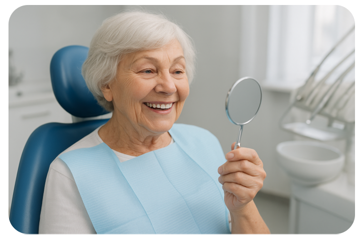 Имплант — это надежный «корень», на который ставится коронка или мост. Он даёт:
