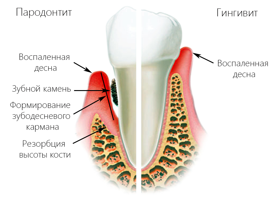 При пародонтите поражается связка зуба и нарушается состав поддесневой жидкости, что ведет к образованию зубного камня не только над десной, но и глубже на корне зуба. Воспаление десны более выраженное, чем при гингивите, может появиться подвижность зубов, оголение шеек и рецессия-убыль десны.