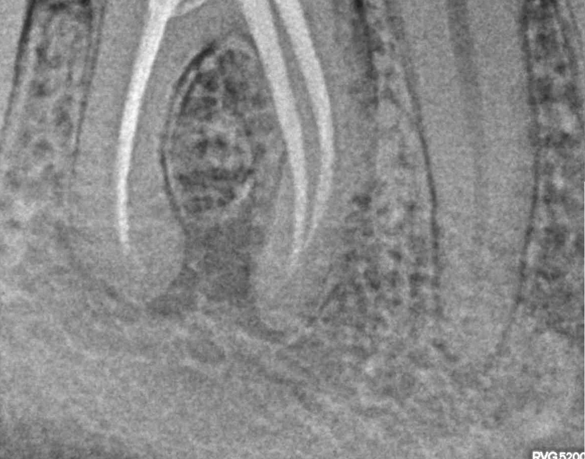Пациент обратился в клинику с постоянными ноющими самопроизвольными болями в зубе, усиливающиеся при накусывании, отечность тканей в области причинного зуба. После детального обследования были обнаружены значительные очаги воспаления на корнях зуба.Решение