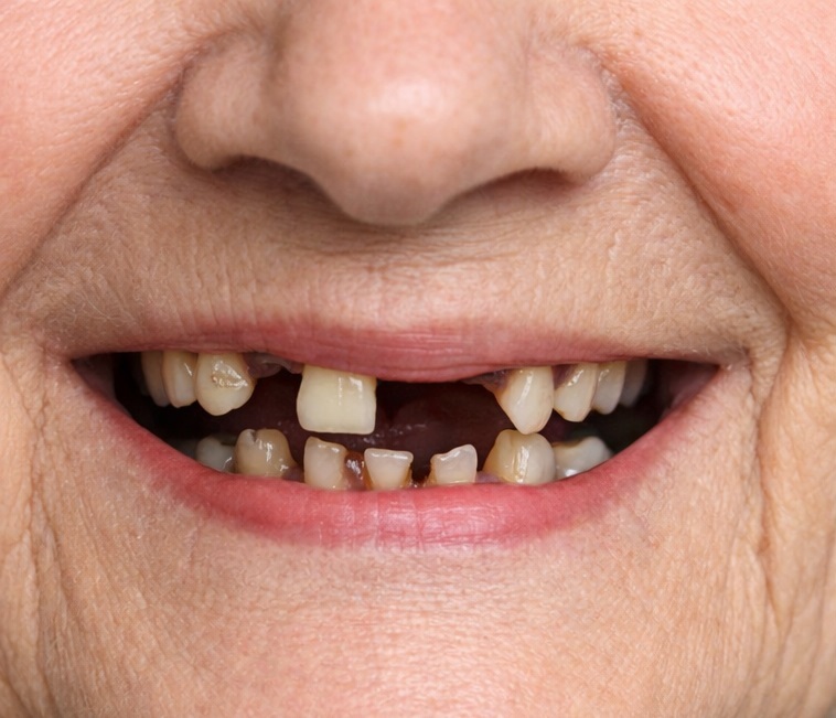 Выраженная частичная адентия (отсутствие нескольких зубов), разрушение оставшихся зубов, нарушение жевательной функции и эстетики улыбки.