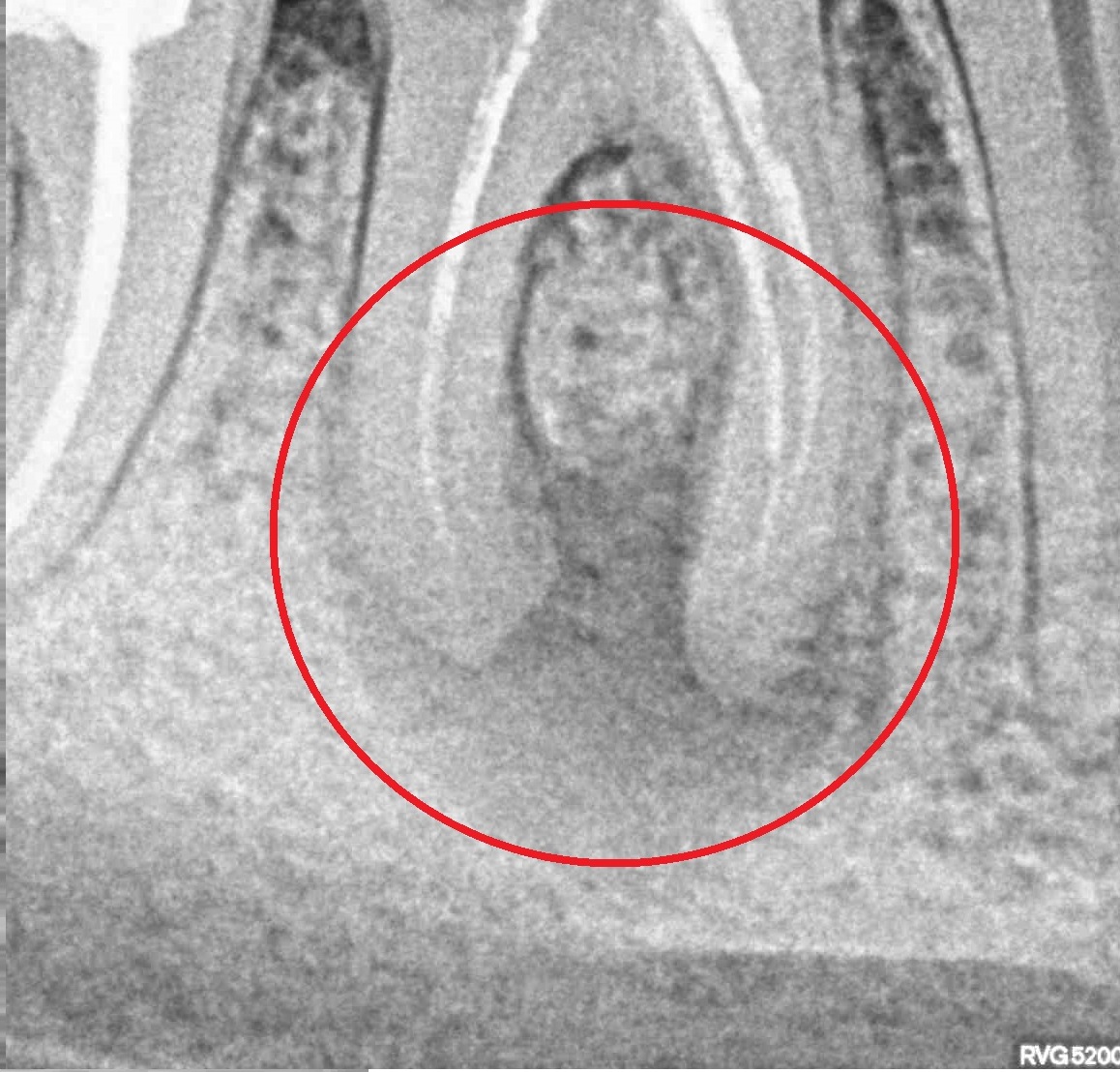Пациент обратился в клинику с постоянными ноющими самопроизвольными болями в зубе, усиливающиеся при накусывании, отечность тканей в области причинного зуба. После детального обследования были обнаружены значительные очаги воспаления на корнях зуба.Решение